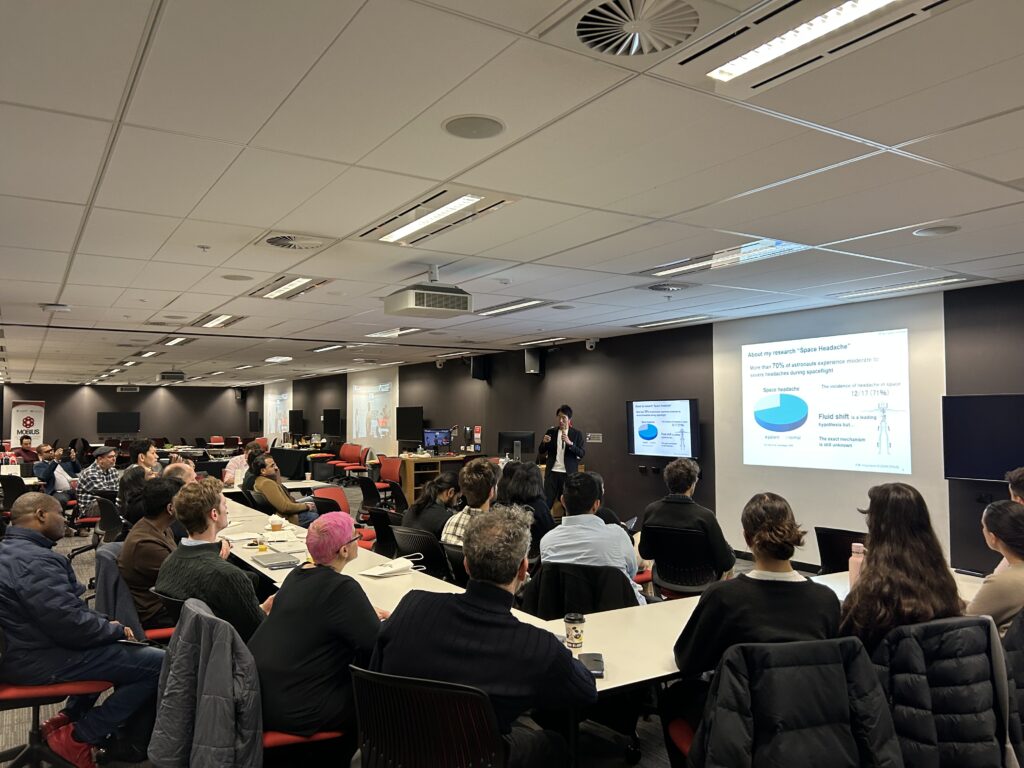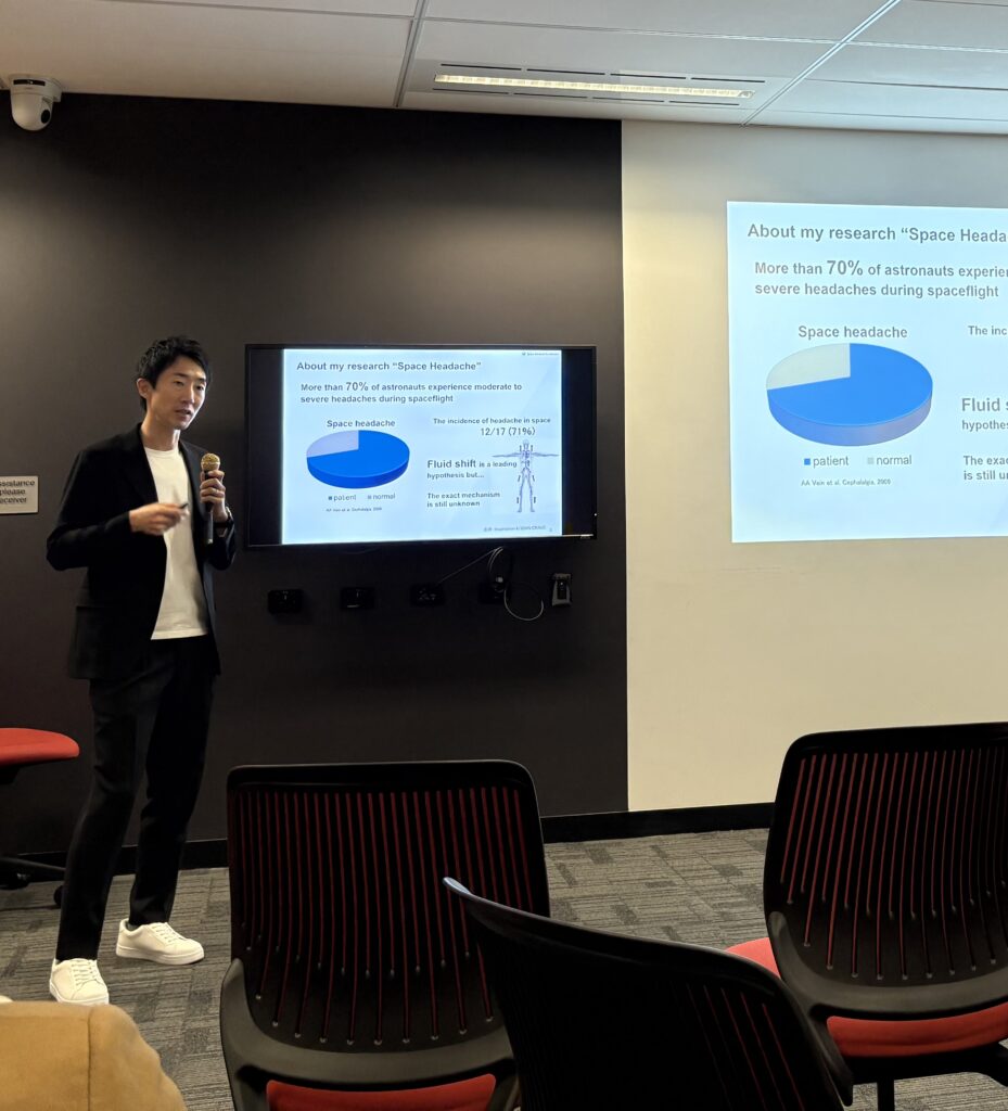 後藤からは、産業界とアカデミアの融合により新たな宇宙医療ビジネスを目指すSMAの取組みの他に、大学院の研究テーマである「宇宙での頭痛についての画像研究」「宇宙での医療課題とニーズ」「バイオセンサーを活かせる宇宙でのシーンについて」などのお話を行いました。